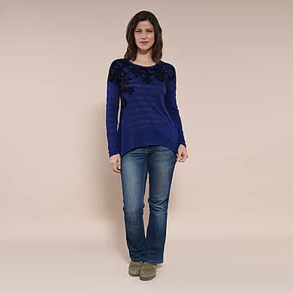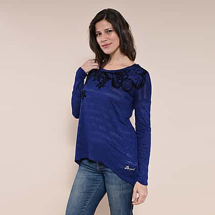 Let your dress do the talking with Desigual’s trendy floral embroidery long sleeve top. The top is all you need to spark the charm on a dinner date or evening party. The top is made from 100% viscose, durable, lightweight, and breathable fabric. Framed with a round neckline and is covered with detailed black colour floral embroidery with long sleeves. The top features horizontal stripes in a navy blue colour shade. One can adorn this top with denim, jeggings or trouser.