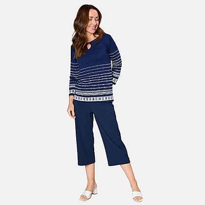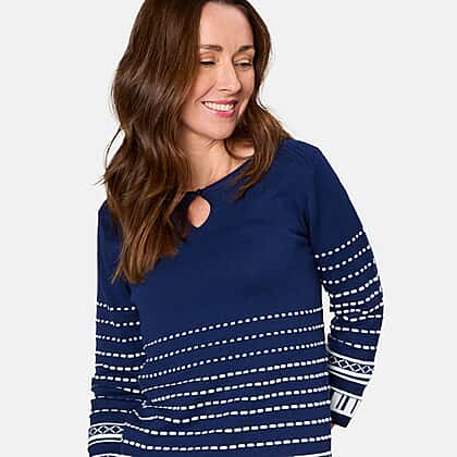 Refresh your wardrobe with the Emreco 3-4 sleeve spot stripe jumper in a beautiful shade of navy. Designed for effortless style and comfort, this lightweight knit features a unique mix of spot and stripe patterns that add a modern twist to a timeless silhouette. The soft fabric feels gentle against the skin, while the 3-4 sleeves and keyhole neckline offer a flattering and relaxed fit. Perfect for pairing with jeans or smart trousers, this jumper combines everyday versatility with subtle sophistication, making it a must-have piece for your casual yet polished wardrobe.