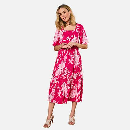 Step into the season with the Emreco short sleeve floral print midi dress, a stunning showcase of craftsmanship and style. This dress is designed with a comfortable viscose fabric draping beautifully over the body, offering comfort and a flattering fit. The vibrant floral print brings a splash of colour to your wardrobe, making it perfect for any spring or summer occasion. Featuring a charming square neckline, this midi dress balances elegance with casual allure, ensuring it's your go-to choice for daytime outings or evening gatherings.