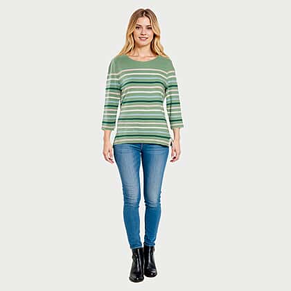 Bring a fresh pop of colour to your wardrobe with this La Marey striped cotton top in soothing green tones. Designed from 100% yarn-dyed cotton, it’s soft, breathable, and easy to style for any occasion. The straight fit and round neckline create a flattering shape, while the 3/4 sleeves and side slits add a touch of ease and versatility. Ideal for pairing with jeans or casual trousers, it’s a relaxed essential for effortless everyday wear.