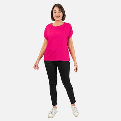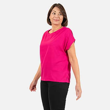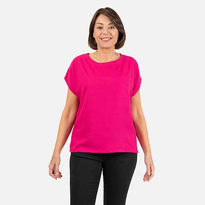 This lady's crew neck linen top is a versatile summer look. It has a semi-fitted shape, wide crew neck, grown-on sleeves and a back keyhole design finished with a button fastening. The side vents and loose fit keep you feeling comfy all day.