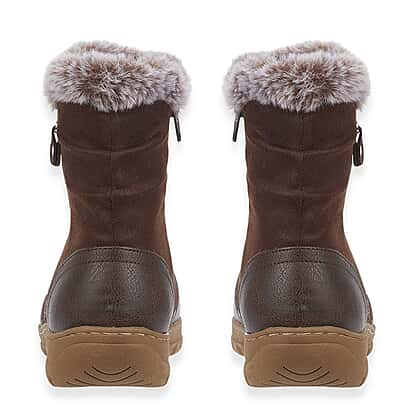 The Hazel Wedge Ankle Boots from the SHOES BY EMMA Collection combine fashion and comfort for a perfect winter essential. Crafted with a cosy fur-lined interior, these boots are designed to keep your feet warm on chilly days. The decorative outer zip adds a stylish touch, while the functional inside zip ensures easy wear. Featuring a low wedge heel, they provide comfort and support for daily errands or casual outings. The sleek black design pairs effortlessly with jeans or leggings, making them a versatile addition to your cold-weather wardrobe.