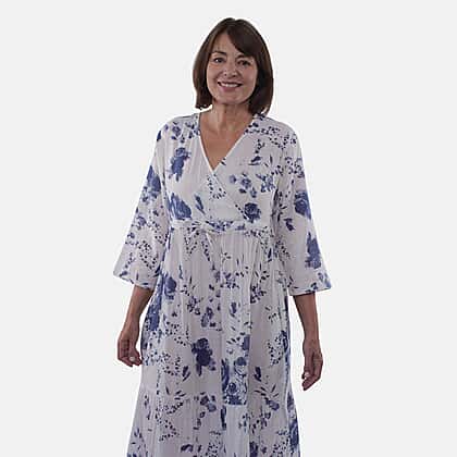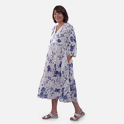 Style this tiered floral maxi dress for your next beach party. It is made from a cotton material which is soft and comfortable to wear, it has a v-neckline with three-quarter sleeves and features two side pockets. You can pair it with flip-flops or sandals to grace the look of your outfit.