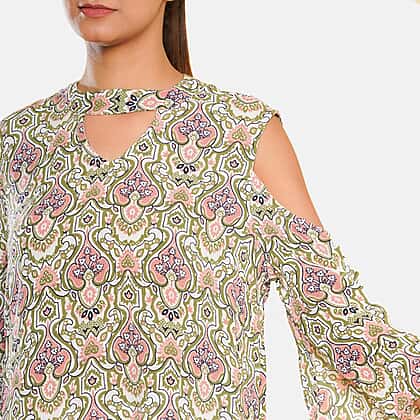 Stand out this fashion season and show off some stylish look with a Tamsy floral printed cold shoulder top. Cut to a relaxed, loose-fit design with pretty floral print all over the fabric and features a crew neckline with cold-shoulder three-quarter sleeves. The top is made from 100% viscose material, which is lightweight, durable, soft and comfy. Pair this easy-to-wear top with your favourite denim and flip-flops for a summer holiday look to take you out from sofa to sun!