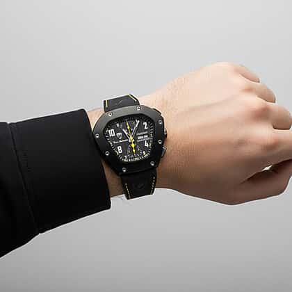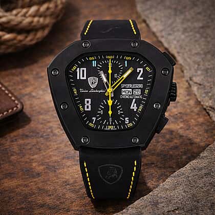 The Tonino Lamborghini Spyderleggero Chronograph Men's Watch TLF-T07-3 is a masterful blend of bold design and Swiss precision. With a striking black and yellow titanium case measuring 51mm, it commands attention while maintaining durability and lightweight comfort. The black multi-dial face, protected by premium sapphire crystal, features batons and a 12-hour chronograph display for refined functionality. Fitted with a sleek black silicone strap and secure buckle fastening, it ensures a comfortable fit for everyday wear. Powered by a reliable Swiss quartz movement, this timepiece is both stylish and practical. Water-resistant and built to perform, it’s perfect for the modern man seeking a statement accessory.