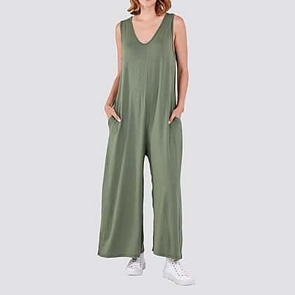 Plain V-Neck Sleeveless Jumpsuit (One Size) - Khaki