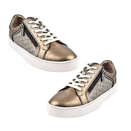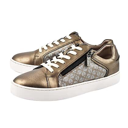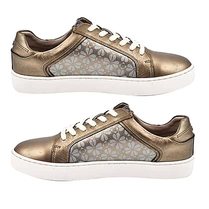 Step out in effortless style with these SANDER by LOTUS floral printed leather casual zip-up women's trainers, designed with a shimmering metallic finish that catches the light beautifully. Crafted from high-quality leather, these trainers showcase elegant floral-printed side panels, adding a feminine touch. The trainers offer dual fastening—a convenient side zip combined with classic lace-ups—allowing quick wear and a secure fit. Featuring cushioned insoles and padded ankle collars, they're superbly comfortable for all-day wear. The crisp white 3cm sole complements the bronze upper perfectly, making these trainers an excellent pick for casual outings, shopping trips, or elevating everyday outfits with ease.