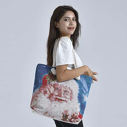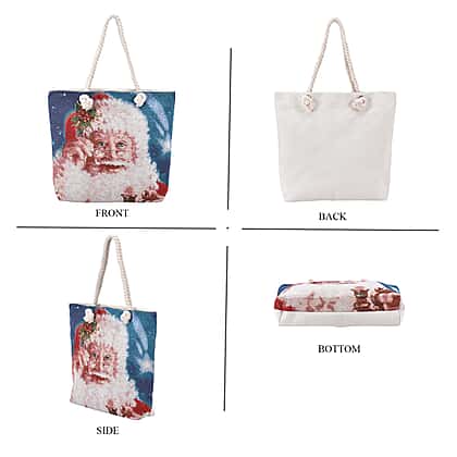 Santa Claus Pattern Jute Tote Bag With Zipped Pockets & Handle Drop - Blue & White