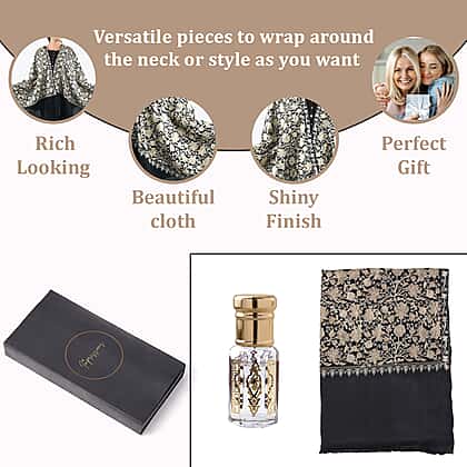 2 Piece Set - Embroidered Stole with Sandalwood Fragrance Oil - Black