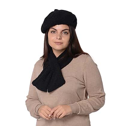 2 Piece Set Faux Fur Winter Scarf Size 13x92 Cm and Hat in Black Colour Size 56 Cm