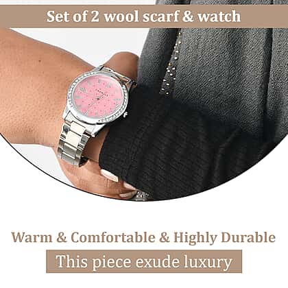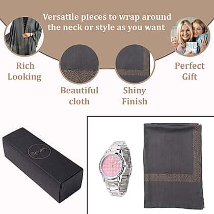 2 Piece Set - Merino Woolen Stole and Rhinestone Wrist Watch in a Gift Box - Grey and Pink