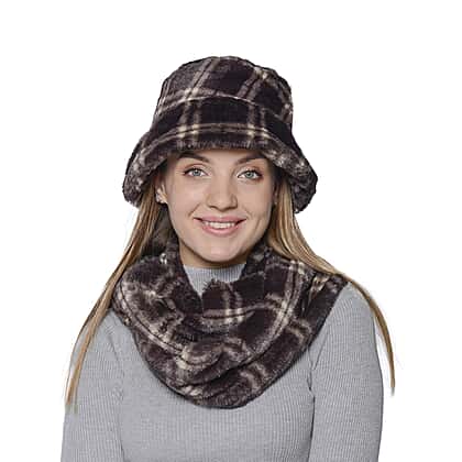 2 Piece Set - Plaid Pattern Faux Fur Hat (70x20cm) and Scarf (16x160cm) - Dark Chocolate Colour