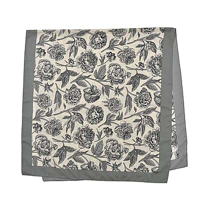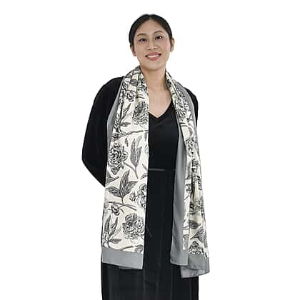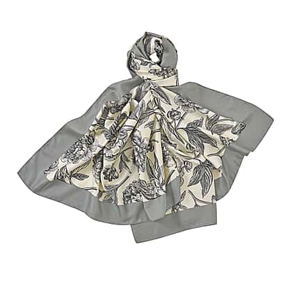 Super Soft Satin Floral Scarf (Size 180x85 cm) - Grey and Cream