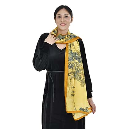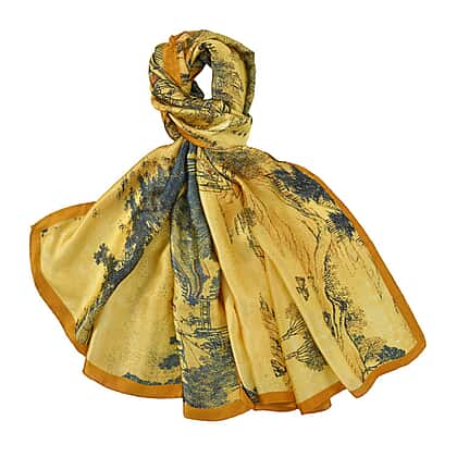 Super Soft Satin Scarf with Tree Pattern (Size 180x85 cm) - Mustard and Blue