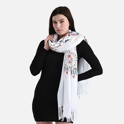 Floral Embroidery Scarf with Tassels (Size 180x70 cm) - White