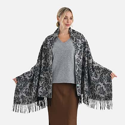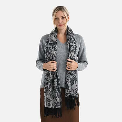 LA MAREY 100% Merino Wool Abstract Print Scarf with Tassel (180 x 70 cm) - Grey