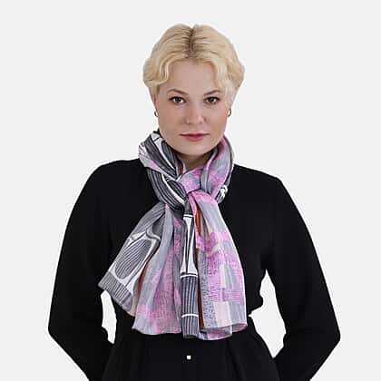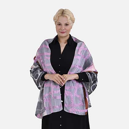 La Marey 100% Mulberry Silk Printed Scarf (Size 170x55cm) - Grey & Pink