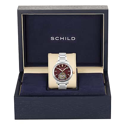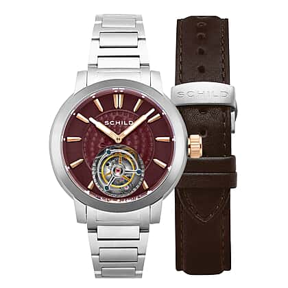 SCHILD Freidrich Mechanical Tourbillion Limited Edition Mens Red Dial 10ATM Water Resistant Watch With Stainless Steel Chain Bracelet & Red Strap