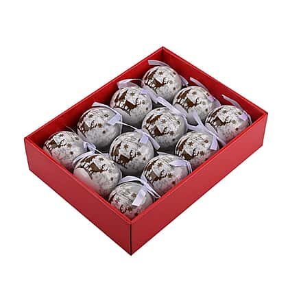 Set of 12 Tree - Deer Pattern Christmas Decoration Balls with Ribbon and Gift Box- White - Red