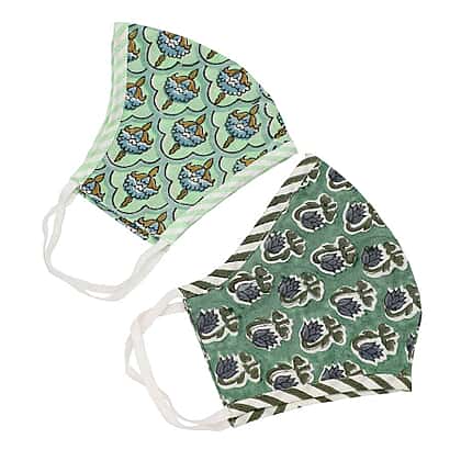 Set of 2 - 100% Cotton Hand Block Printed Reusable Double Layer Face Cover (One Size Fits All) - Dark and Light Green