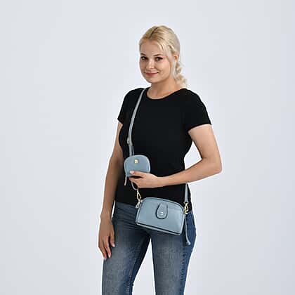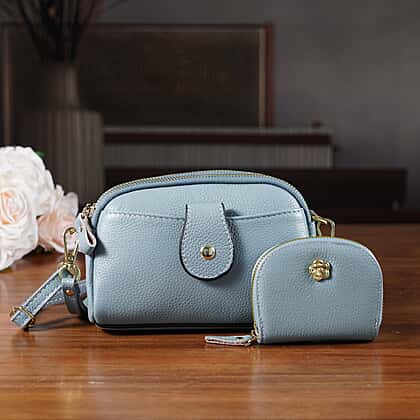 Set of 2 - 100% Genuine Leather Crossbody Bag & Card Wallet with RFID Protection - Dusty Blue