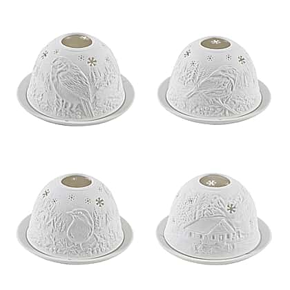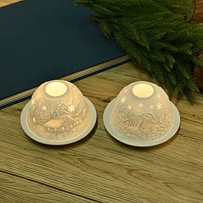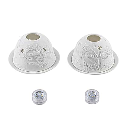 Set of 2 Bird & Deer Printed Porcelain LED Tealight Candle Holder - White