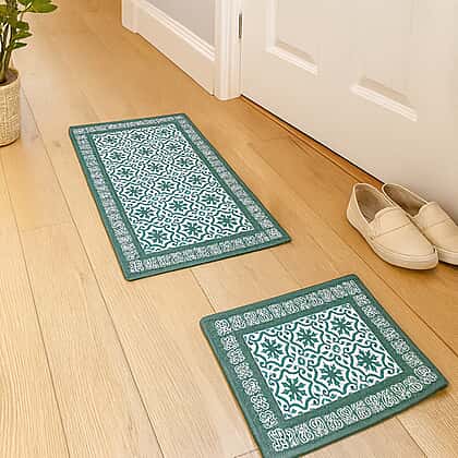 Add warmth and style to your home with this set of two green printed cotton mats—a door mat and matching runner. Designed with a fresh geometric pattern in green and white, door mat (65cm x 45cm) and a matching runner (120cm x 45cm) offer a smart way to dress up kitchens, entryways, or cosy corners. Crafted from a soft yet sturdy 70% cotton and 30% polyester blend, they’re made to withstand daily foot traffic while feeling gentle underfoot. Lightweight and fitted with an anti-slip base for added safety, these mats are as practical as they are attractive. Both pieces are machine washable, making everyday cleaning quick and easy.