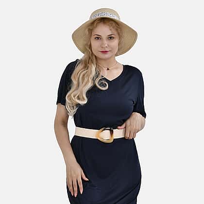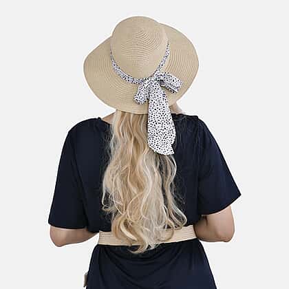 Set of 2 Paper Straw Patterned Hat (58cm) & Elastic Belt (100x5cm) - Beige