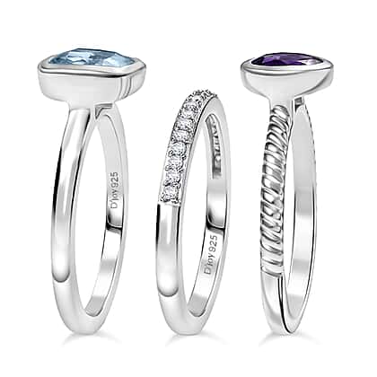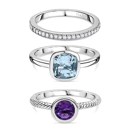 Set of 3 - African Amethyst, Sky blue Topaz and White Zircon Stackable Ring in Rhodium Overlay Sterling Silver 2.71 Ct.