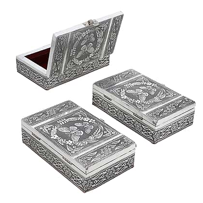 Set of 3 Handcrafted Aluminium Butterfly Embossed Storage Box (Size 16x10x4 cm)