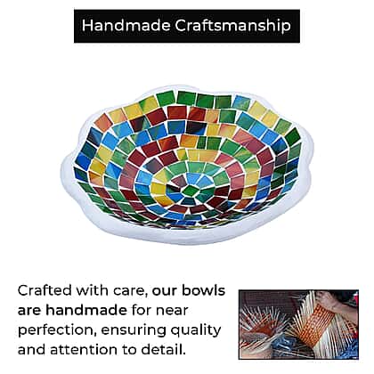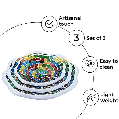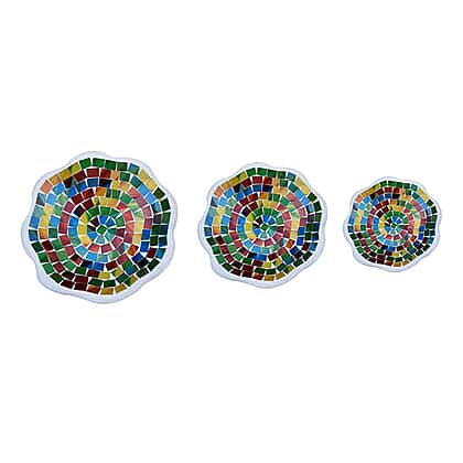 Serve delicious food on this beautiful handmade set of three mosaic terracota plates. This plate features multi-colour prints and patterns and is handmade for near perfection. The mosaic design is made from glass and mirror mosaic tiles and then glued onto a terracotta plate with clear glue and painted with the colour craft before attaching the mosaic tiles to give it a colourful touch. You can gift this set of three plates to your loved ones this festive season.