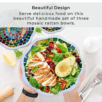 Set of 3 Handmade Mosaic Terracotta Rattan Bowl - Multi