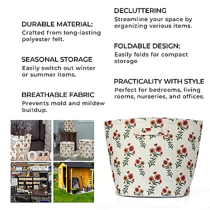 Declutter in style with this set of 3 printed round storage organisers. Designed to blend practicality and aesthetics, these organisers come in three different sizes, making them perfect for storing everything from toys to clothing or accessories. The colourful printed design adds a playful touch to your space, making them as decorative as they are functional. Each box features a durable construction with a soft polyester fabric finish and sturdy handles, allowing for easy transport. Whether placed in your living room, bedroom, or wardrobe, these storage organisers offer a chic and organised solution for all your storage needs.