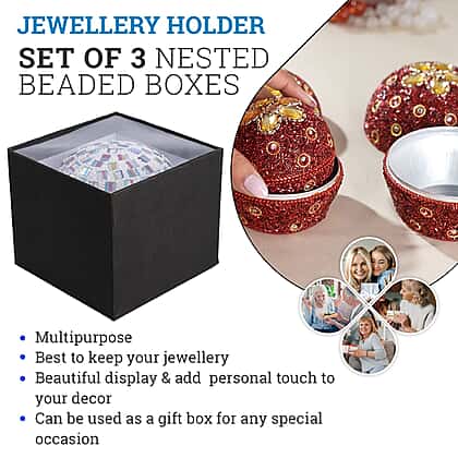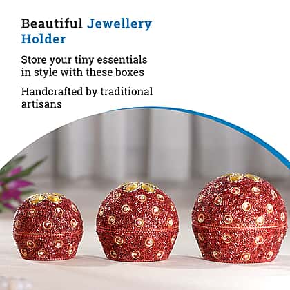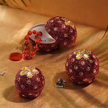 Organise your dressing table with this set of 3 nesting metallic jewellery boxes and bring a new look. This box is made from MDF material which offers dens, durable and robust construction, making it lightweight, smooth-surfaced and hard to crack. It features a unique metalwork detailing outside the spherical box, making it more sparkling and shining. It can store all your jewellery pieces and prevent them from damaging and tarnishing.