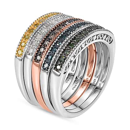 Set of 5 - D'Joy Champagne Diamond, Green Diamond, Yellow Diamond, White Diamond & Blue Diamond Half Eternity Stackable Ring in Sterling Silver 0.50 Ct, Silver Wt. 8.10