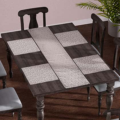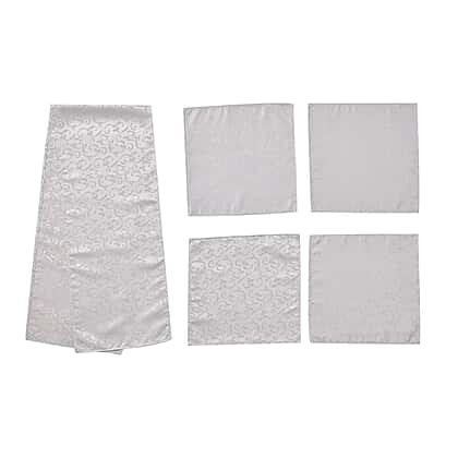 Give a fine dining experience to your guest by decorating your table with this set of four cloth napkins and a runner. This set is made from 100% polyester fabric which has good shape retention and wrinkle resistance, it is a water-resistant fabric which is easy to clean and maintain. This runner and napkin set is adorned with the jacquard scroll pattern and will be a great decoration and protection for your table.