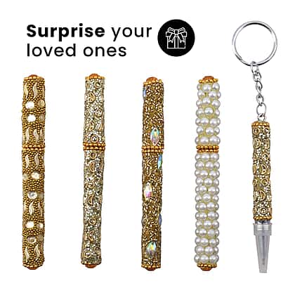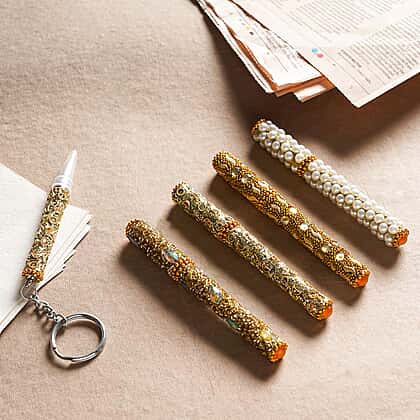 This set of five rhinestone beaded pens in mustard makes your writing experience smooth and fancy. These pens have metal bodies decorated with beads, glitters and mirrors, giving them a bright shine and sparkle. This vintage-style pen is handcrafted, gives you a smooth writing experience and has a keyring attached on the top to use as a keychain. You can gift this set of five decorative pens to your loved one or use it as a decorative piece in your office or home.