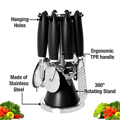 Set of 8 - Kitchen Ware (Includes Can Opener, Peeler, Ice Cream Spoon, Pizza Cutter, Bottle Opener, Strainer, Grater and 360 Degree Rotating Stand) - Black