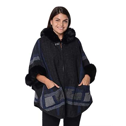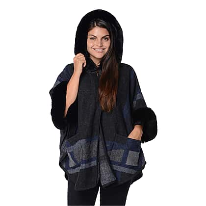 Geometry Pattern Half Round Shape Blanket Wrap with Faux Fur Hat, Sleeves and Two Front Pockets (Size 76x107 Cm) - Black