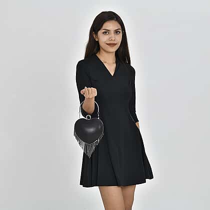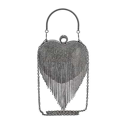 This heart-shaped clutch bag's flair will add a chic style to your attire. The beautiful design of this sheeny bag will match your casual, formal and party ensembles. The heart shape of this bag is crafted using high-quality material and is adorned with crystal-studded tassels to have a contemporary look. The clutch clasp secures the compartment with a polyester-made inner to avoid scratches. It has a detachable metallic strap.