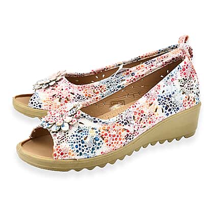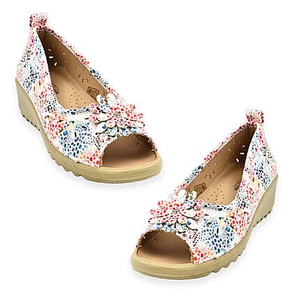 Step into comfort and style with the Shoe Tree Comfort Slip-On Wedge Peep Toe Shirley Shoe. This chic faux leather shoe features a wedge heel and a stylish peep toe adorned with a charming floral trim, making it a perfect match for your favourite summer dresses. Designed for effortless wear and enduring comfort, it’s ideal for long summer days and every casual or semi-formal outing.