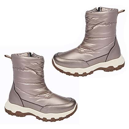 Step confidently into winter with the Shoes by Emma Valais Water Resistant Snow Boots. Crafted in a chic champagne shade, these stylish boots combine practicality with modern appeal. The water-resistant finish keeps your feet dry on damp days, while the plush warm lining ensures comfort in cold conditions. Designed with a chunky cleated sole for extra grip and stability, they’re perfect for frosty walks or casual outings. The inside zip allows for easy wear, and its sleek silhouette adds a fashionable touch to any winter outfit. A snug, slightly smaller fit ensures secure all-day wear.
