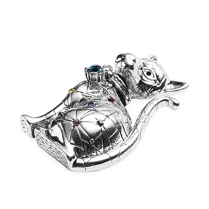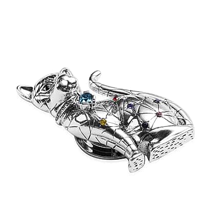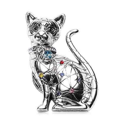 Simulated Aquamrine and Multi Colour Austrian Crystal Cat Magnetic Brooch in Black Plating and Silver Tone