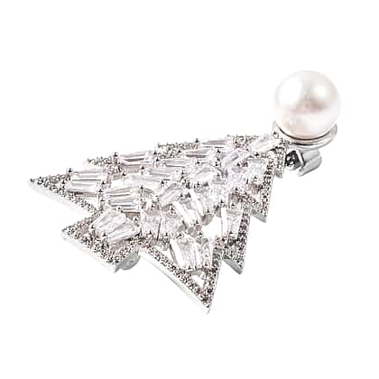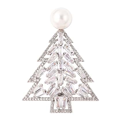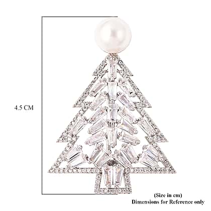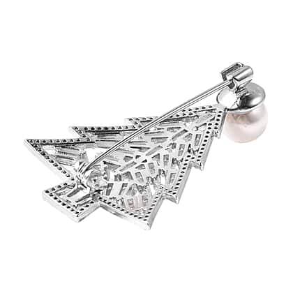 Simulated Diamond and White Shell Pearl Christmas Tree Brooch in Silver Tone