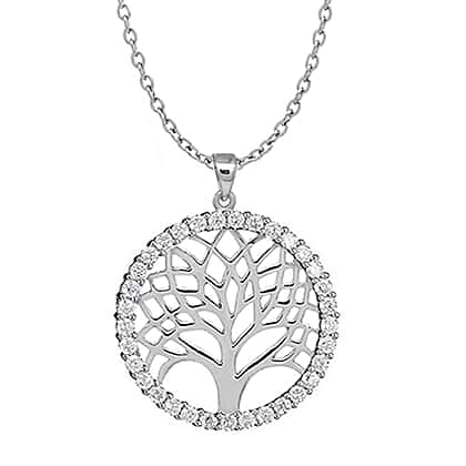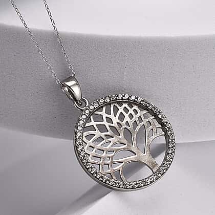 Simulated Diamond Tree of Life Pendant with Chain (Size - 18) in Rhodium Overlay Sterling Silver