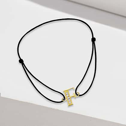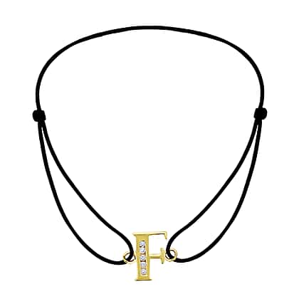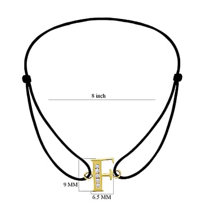F Initial Black Cord Adjustable Bracelet 4.5 Inch to 8 Inch in 9K Yellow Gold Cubic Zirconia 6.5mm x 9mm