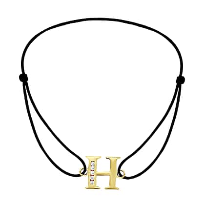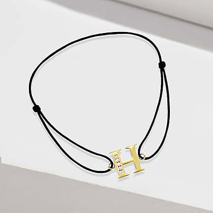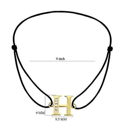 H Initial Black Cord Adjustable Bracelet 4.5 Inch to 8 Inch in 9K Yellow Gold Cubic Zirconia 9.5mm x 9.5mm