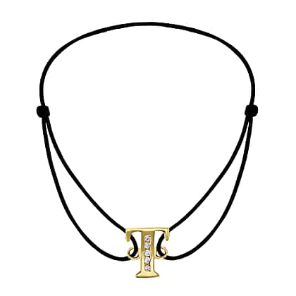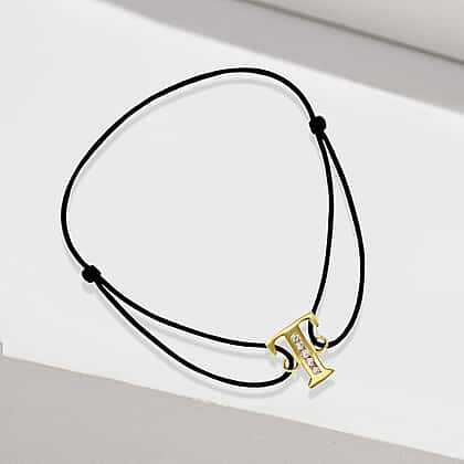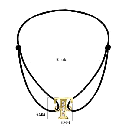 T Initial Black Cord Adjustable Bracelet 4.5 Inch to 8 Inch in 9K Yellow Gold Cubic Zirconia 8mm x 9.5mm