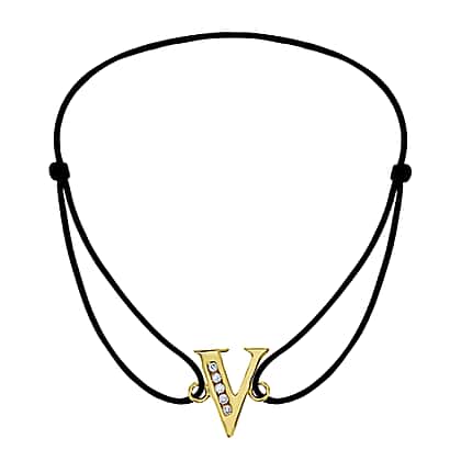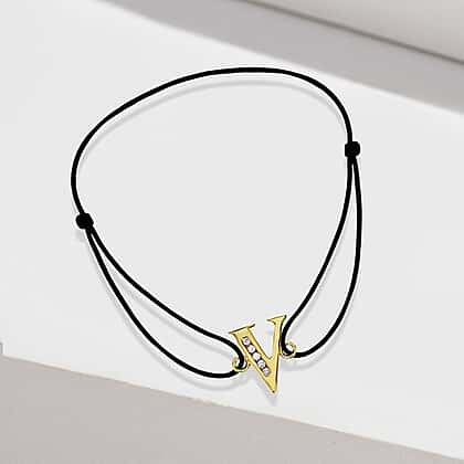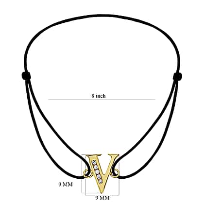 V Initial Black Cord Adjustable Bracelet 4.5 Inch to 8 Inch in 9K Yellow Gold Cubic Zirconia 9mm x 10.5mm