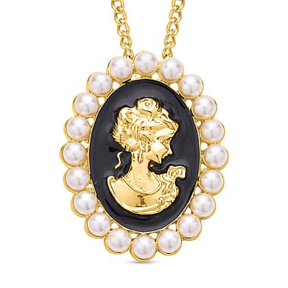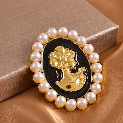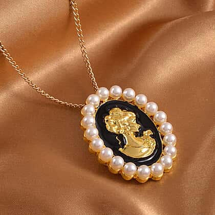 Adding this simulated pearl cameo pendant and brooch will add to your collection with two purposes. The minimalist artwork will add to your attire and get you all the attention, even in the most unexpected gathering. Crafted using mixed metal, The pendant is given a circular shape and has a black enamelled shank. This cameo is made with a portrait of a beautiful woman's profile with a golden lustre and is outlined by simulated pearls. The bail and clip on the back allow you to use it freely on your neck or attach it to your coat like a brooch for a more dressed-up look.